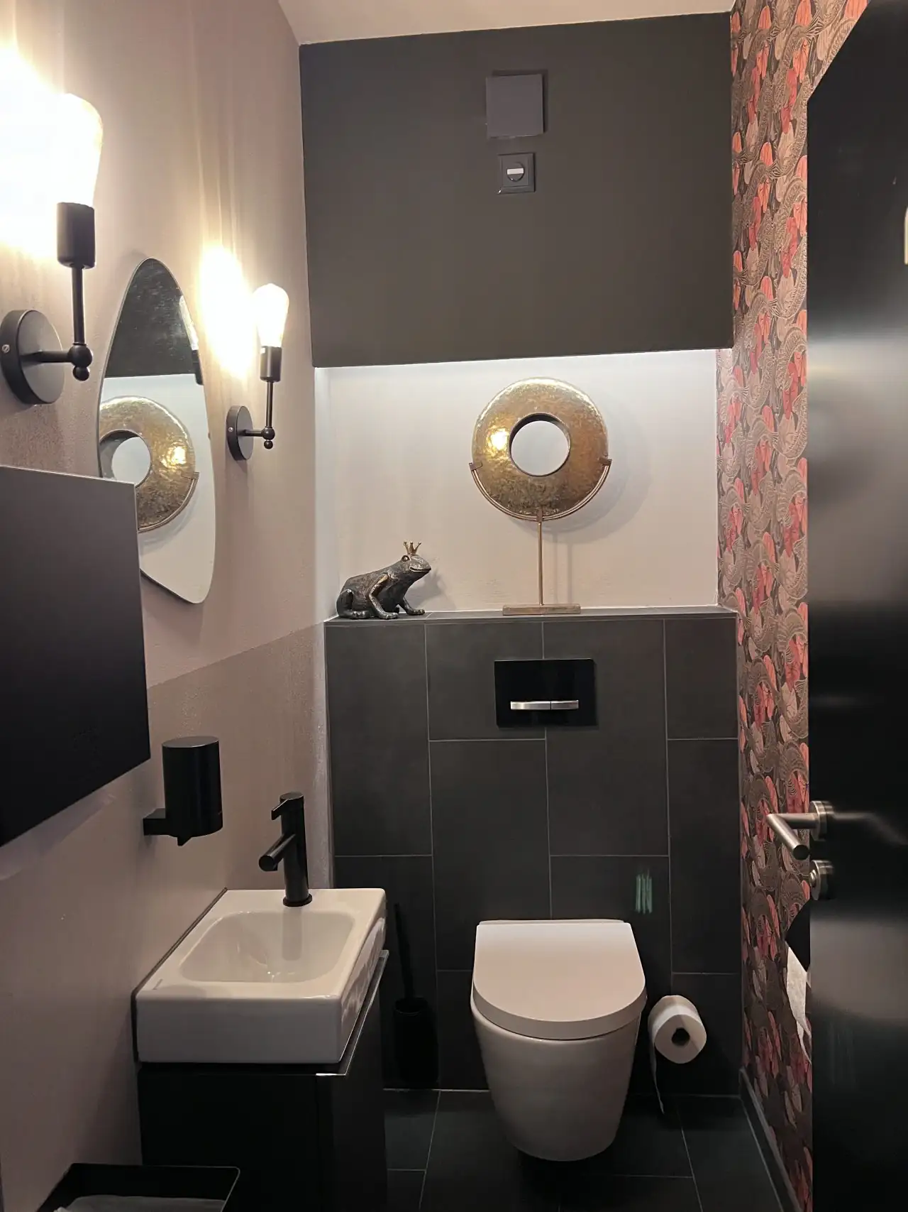 Auch die angrenzenden Sanitärbereiche wurden von uns neu gestaltet. Klare Formen, hochwertige Oberflächen und individuelle Lösungen sorgen dafür, dass selbst die Nebenräume den hochwertigen Stil der Lounge widerspiegeln. Ein durchdachtes Raumkonzept, aus einem Guss – vom ersten Sitzplatz bis zum letzten Detail an der Wand.