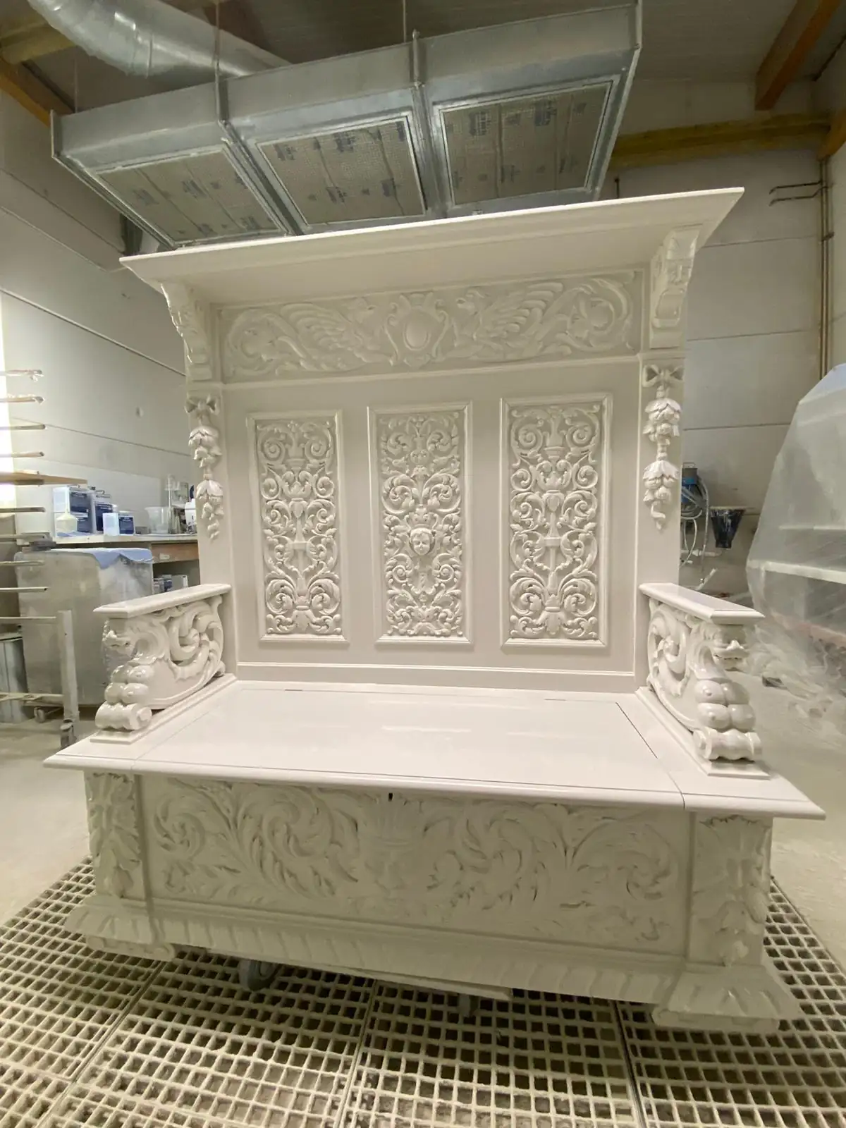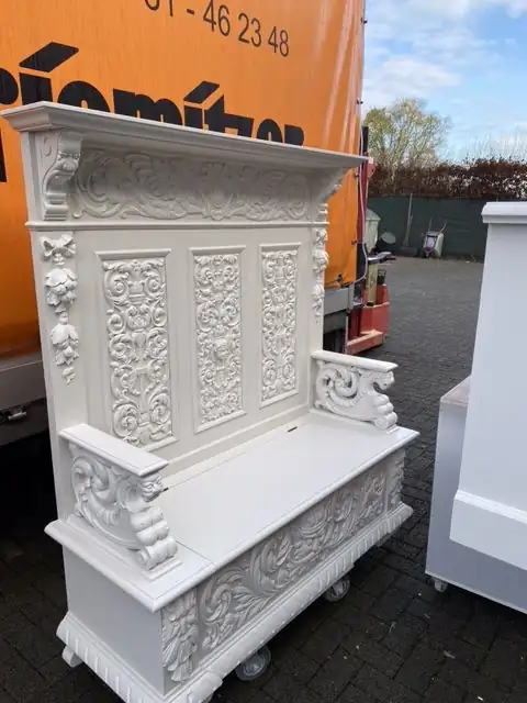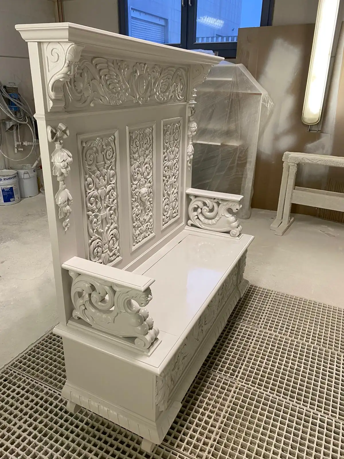 Dieses außergewöhnliche Möbelstück ist mehr als eine Sitzbank – es ist ein Stück Handwerksgeschichte. In unserer Werkstatt wurde die historische runkbank mit größter Sorgfalt restauriert und neu veredelt: filigrane Ornamente, markante Reliefs, handgearbeitete Details. Ein Einzelstück, das zeigt, was echte Schreinerkunst kann. Mit Ruhe, Respekt vor dem Original und moderner Technik entsteht ein Möbel, das Vergangenheit bewahrt und Zukunft bekommt.