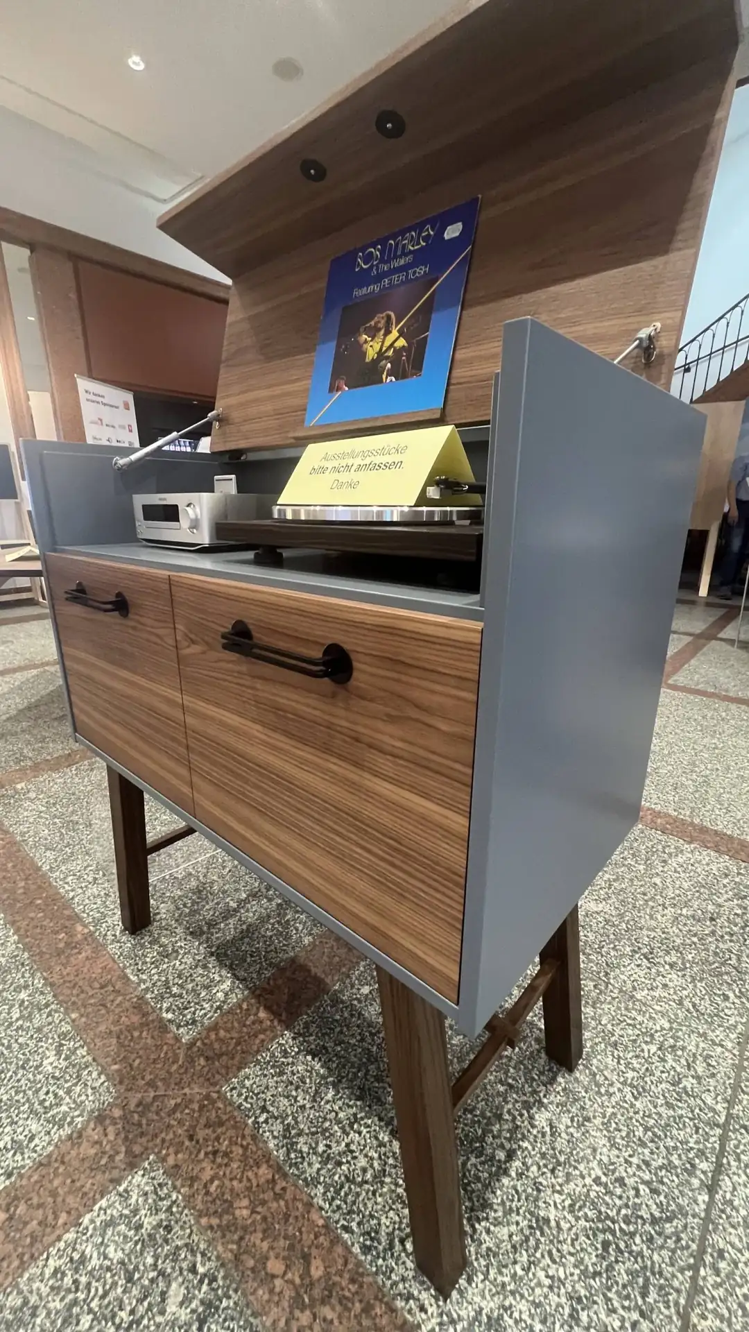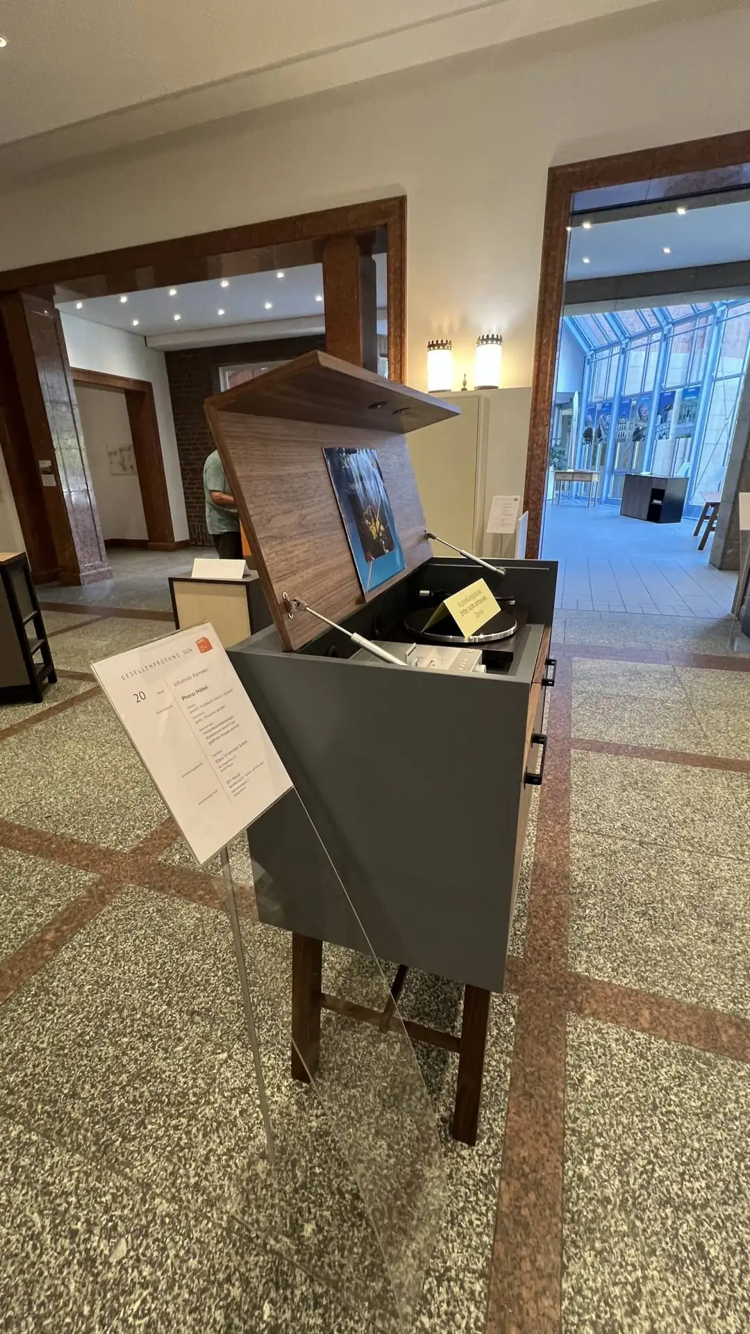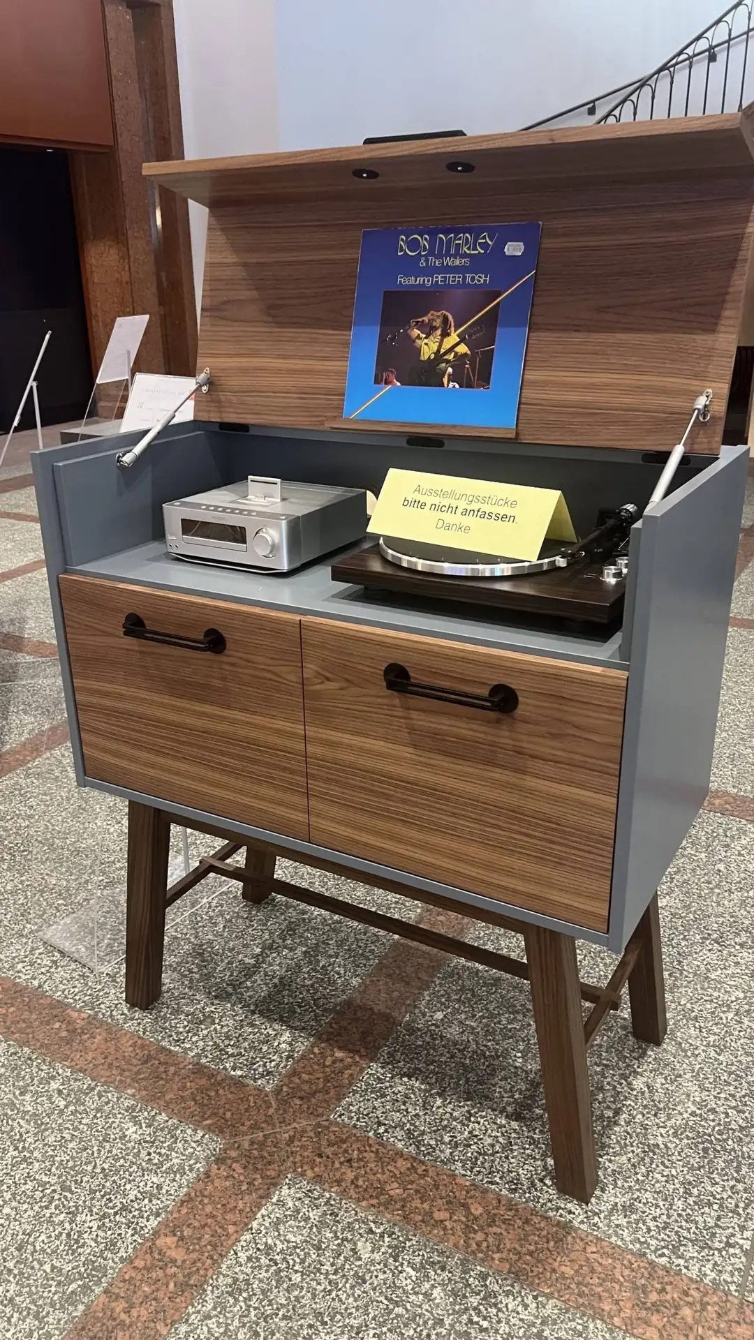 Dieses Gesellenstück verbindet Möbelbau mit Leidenschaft für Musik. Der Korpus ist bewusst kompakt gehalten und auf das Wesentliche reduziert – getragen von schlanken Beinen, die dem Möbel Leichtigkeit und eine fast wohnliche Eleganz verleihen. Die aufklappbare obere Ebene macht das Innenleben zum Erlebnis: Technik, Schallplatte und Bedienung werden sichtbar, greifbar und Teil der Gestaltung. Ein Gesellenstück mit Persönlichkeit: handwerklich sauber umgesetzt, gestalterisch eigenständig und mit einer Idee, die über das reine Möbel hinausgeht.