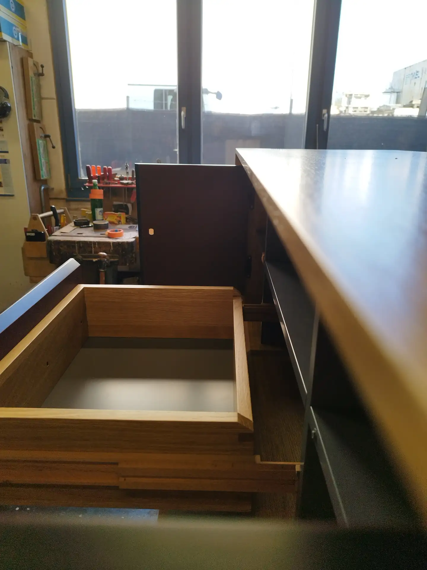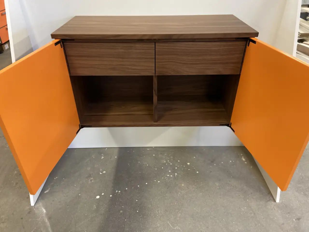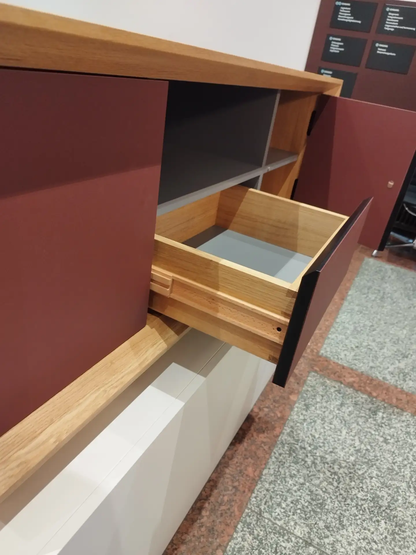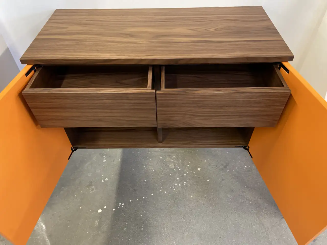 Dieses Sideboard zeigt, wie viel Gestaltungskraft in einem durchdachten Möbel steckt. Klare Proportionen, ruhige Flächen und ein spannender Materialmix aus warmem Holz und farbigen Fronten verleihen dem Möbel eine selbstbewusste Präsenz. Die präzise gearbeiteten Schubkästen, sauberen Kanten und fein abgestimmten Fugen zeigen handwerkliche Qualität bis ins Detail.