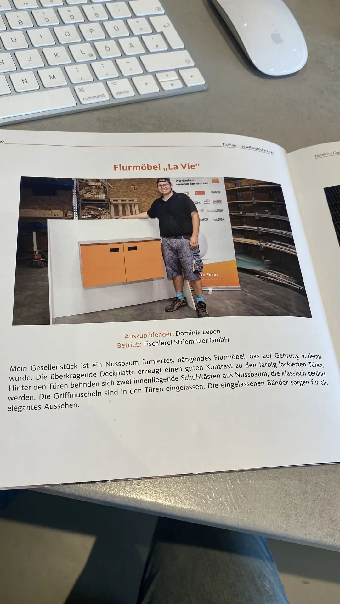 Holz, Glas und Metall greifen harmonisch ineinander. Jede Fuge sitzt, jede Oberfläche ist durchdacht, jede Lösung handwerklich sauber umgesetzt. Das Möbel ist nicht nur Stauraum, sondern ein echtes Präsentationsstück – gemacht, um zu wirken und benutzt zu werden. Unsere Gesellenstücke entstehen im Team, mit Zeit zum Denken, Ausprobieren und Perfektionieren. Sie zeigen, was möglich ist, wenn junge Handwerker Verantwortung übernehmen dürfen – und wenn Handwerk nicht nur gelehrt, sondern gelebt wird.