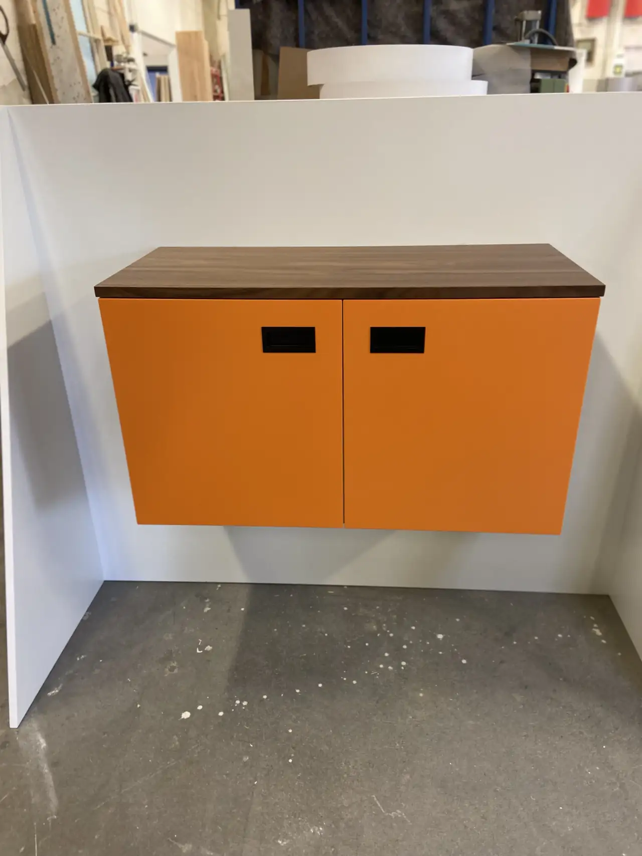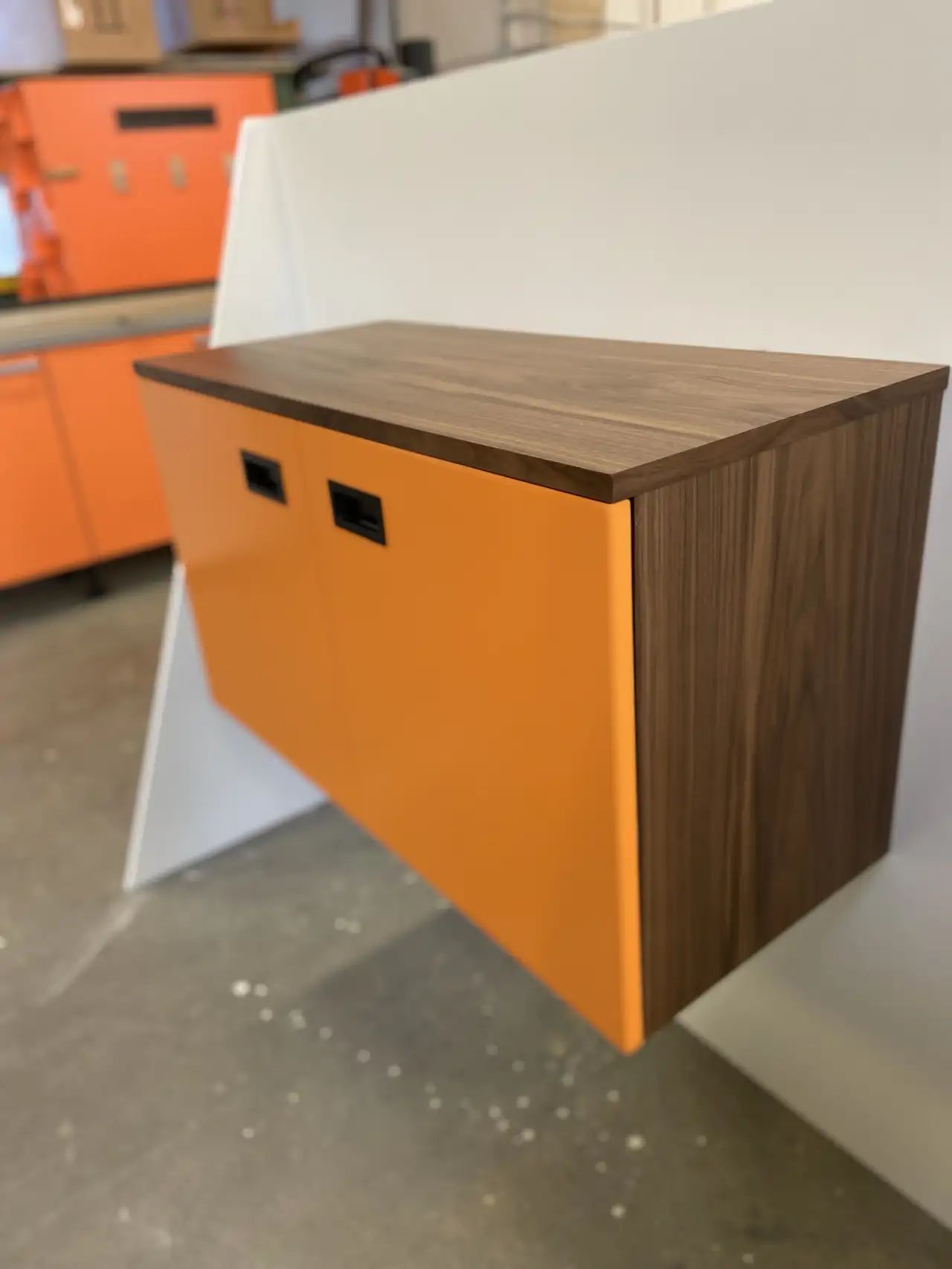 Dieses Gesellenstück zeigt ein TV-Sideboard, das bewusst reduziert gestaltet ist – und gerade dadurch Wirkung entfaltet. Der hängende Korpus wirkt leicht und präzise, die orangefarbenen Fronten setzen einen selbstbewussten Akzent und kontrastieren klar mit dem warmen Holzton des Korpus. Das Möbel ist als Einzelstück gedacht – klar, funktional und langlebig. Ein Gesellenstück, das nicht nur Gestaltung beweist, sondern auch zeigt, wie viel Sorgfalt, Präzision und eigenes Denken in moderner Tischlerarbeit steckt.