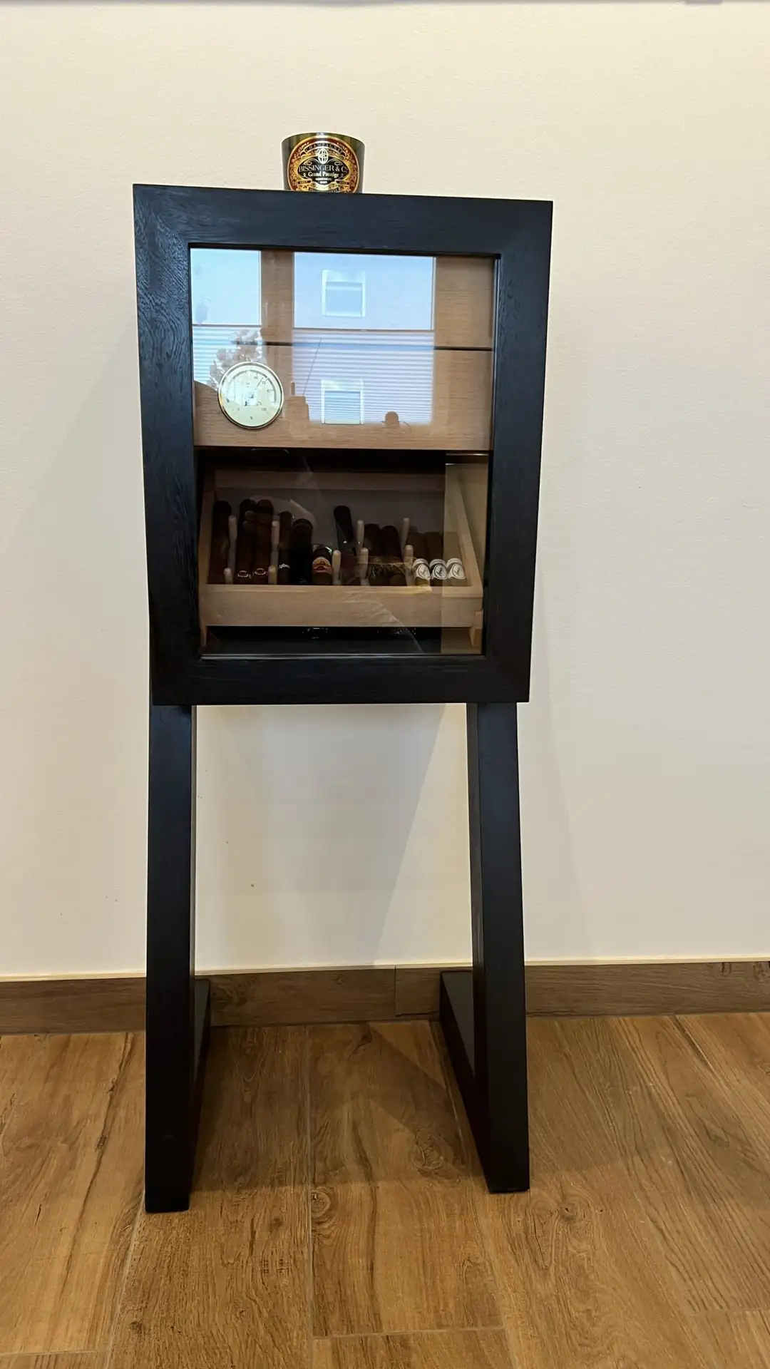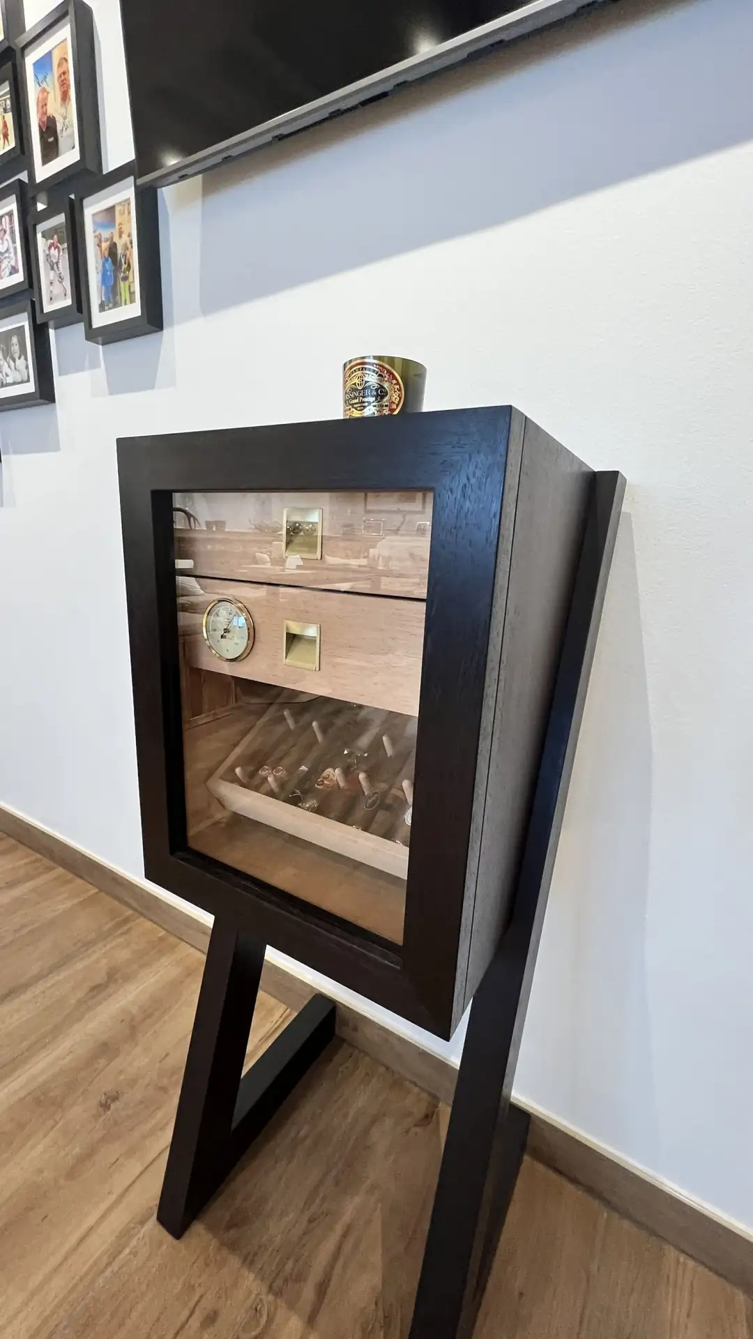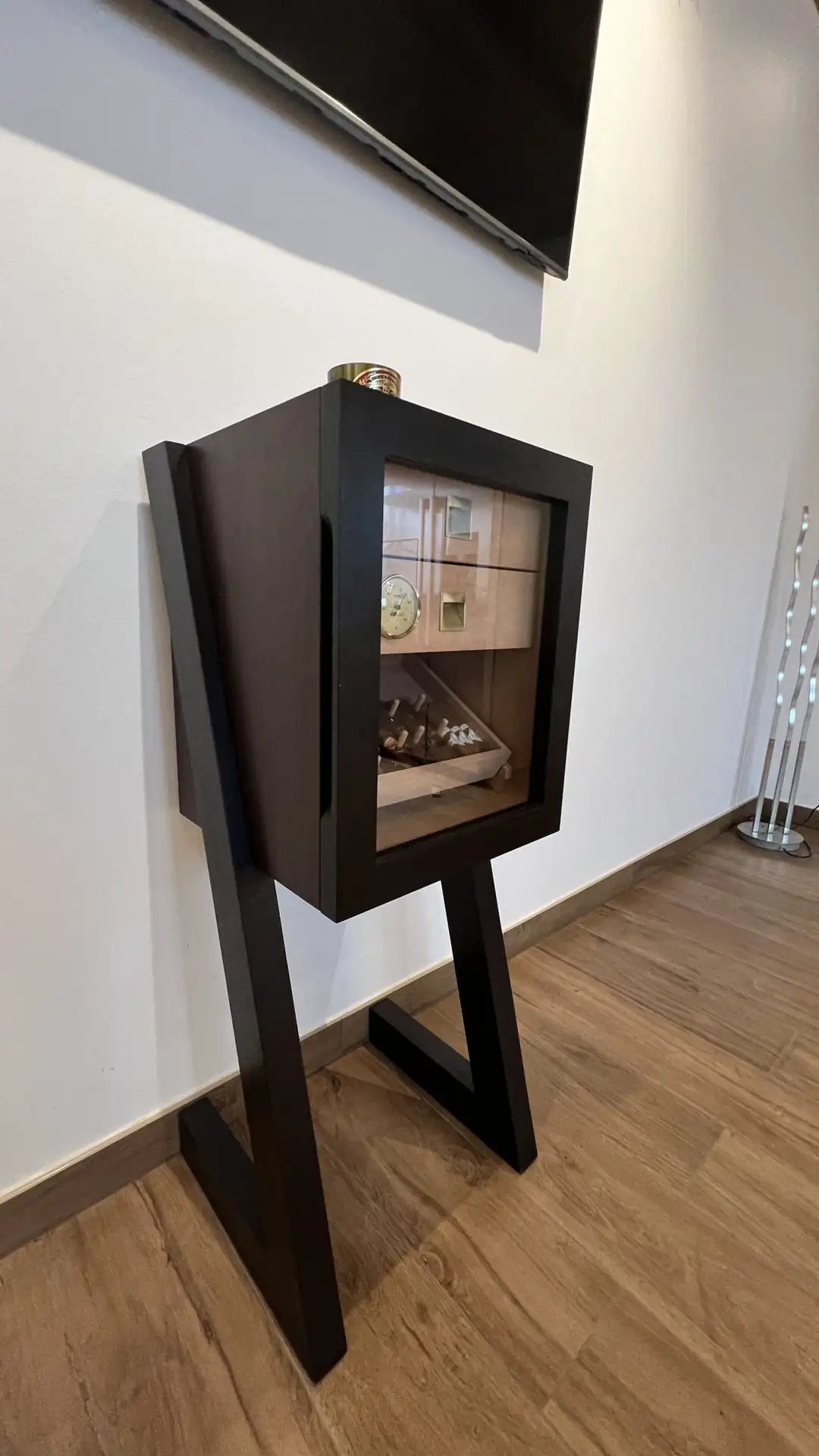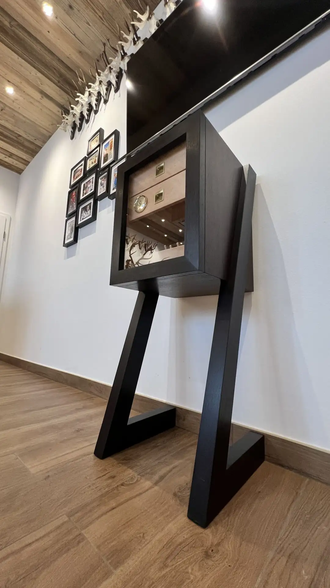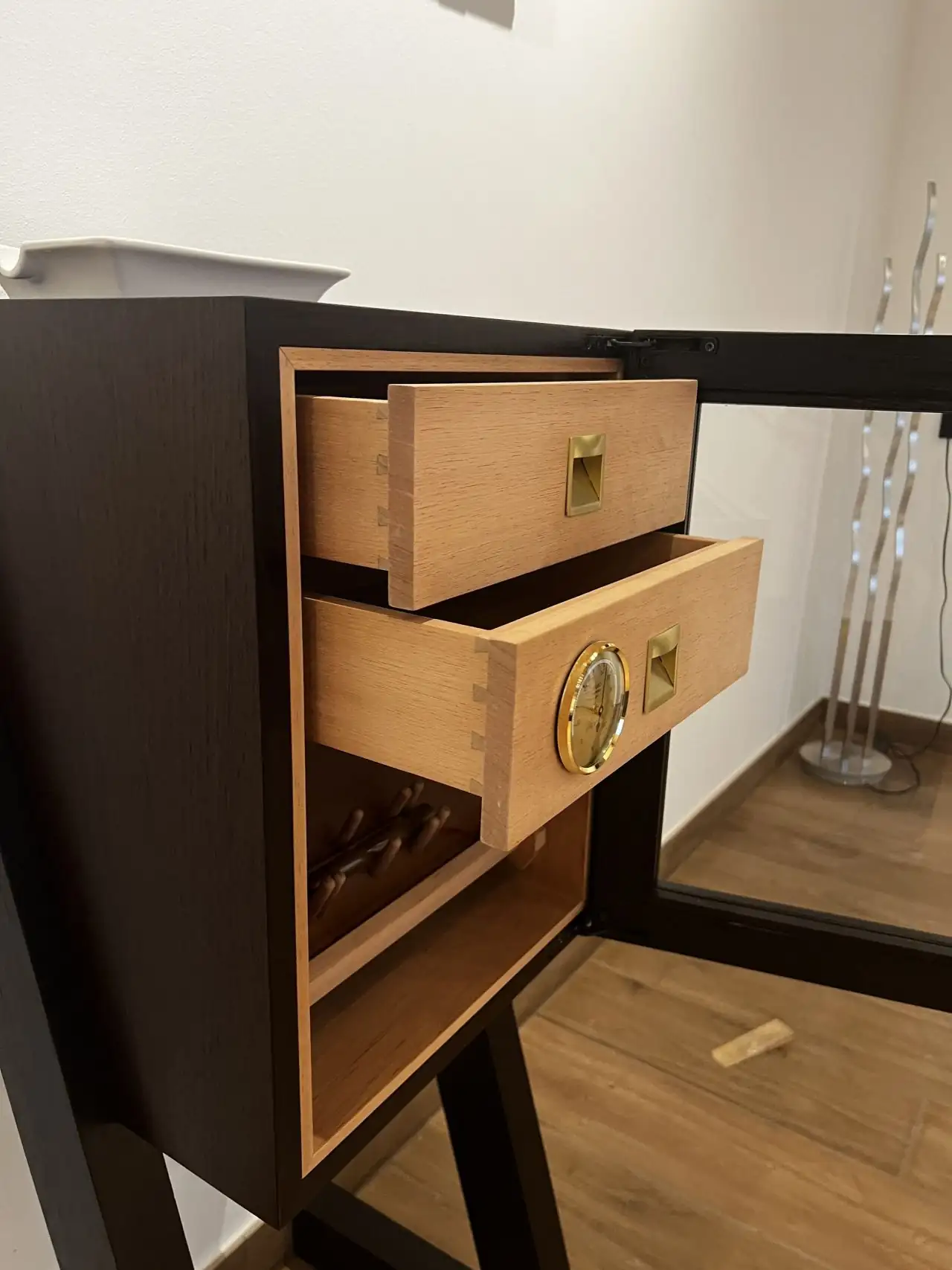 Dieses Gesellenstück zeigt, wie viel Präzision und Feingefühl im Detail stecken. Ein freistehender Humidor, der Funktion und Gestaltung vereint: sauber gearbeitete Schubladen, ein integriertes Hygrometer, fein abgestimmte Proportionen und hochwertige Materialien, die bewusst sichtbar bleiben.